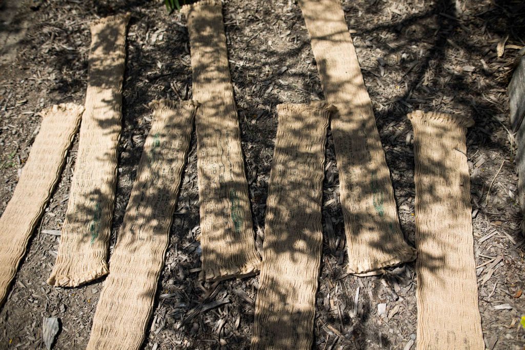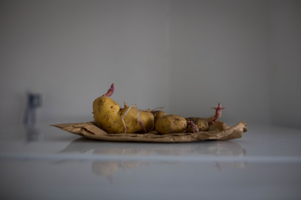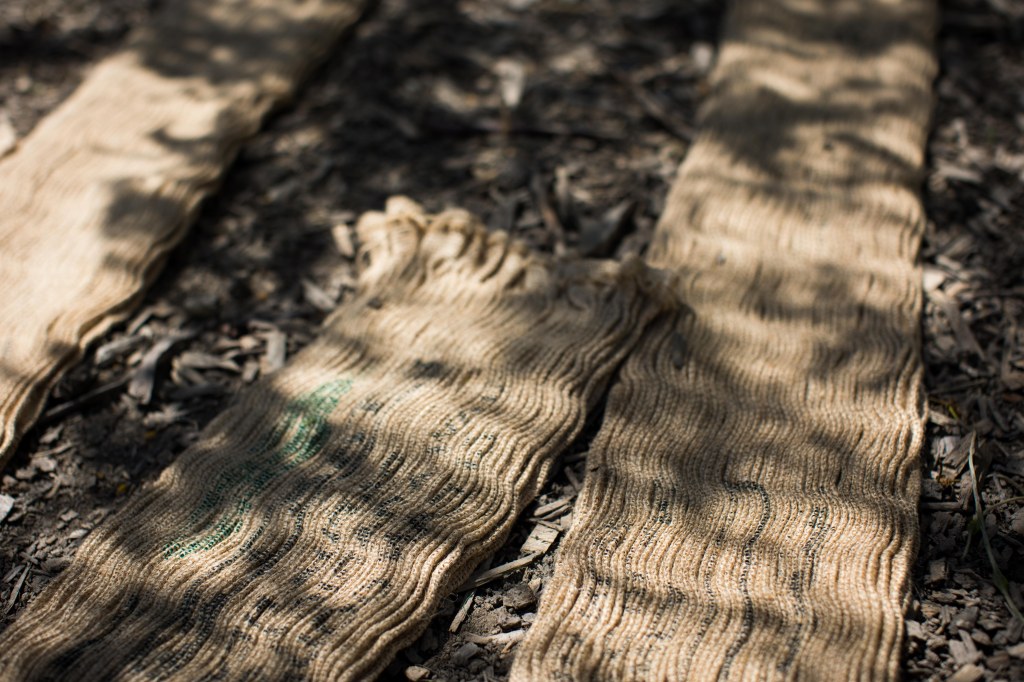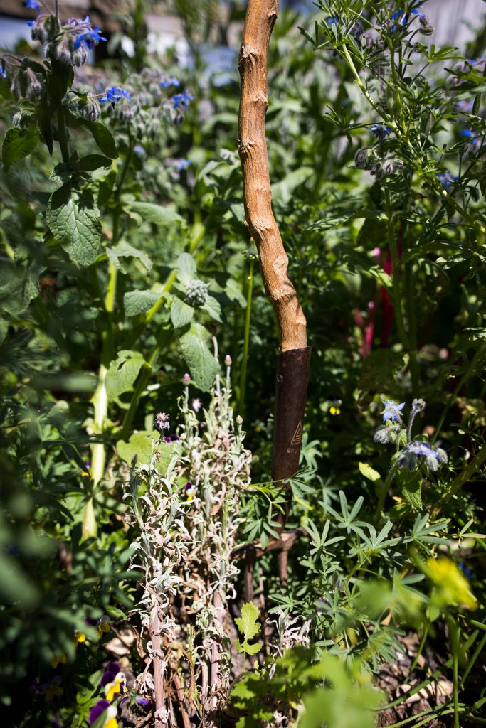 Nature’s Fresh bread bags, plied – sacks from neighbourhood coffee roastery, smocked – thread salvaged from potato sacks – my favourite garden fork – Walking Stick Kale grown in various neighbourhood gardens – seed and seed pods saved from Walking Stick Kale – used plant pot – nails salvaged from rotting pallets once used to hold motherload-motherlode (2017-2018) compost heap – palings from our back fence – rotted sack exhumed from the neighbourhood compost heap – last summer’s plant ties cut from old t shirts – our neighbour’s washing line – lump of bread made with sourdough mother used during The making of bread, etc. (2019-2020) – forgotten potato, remembered.