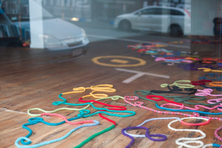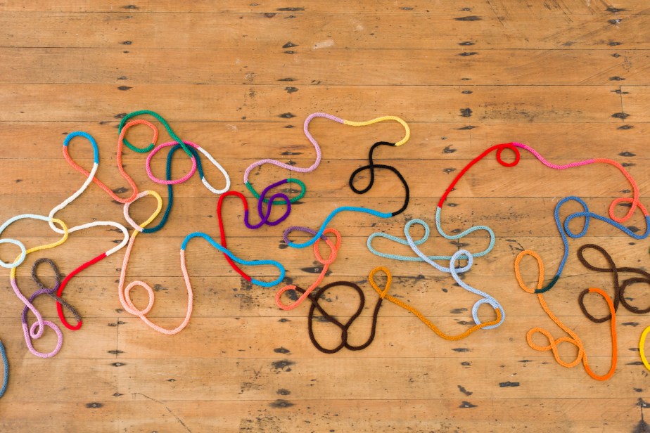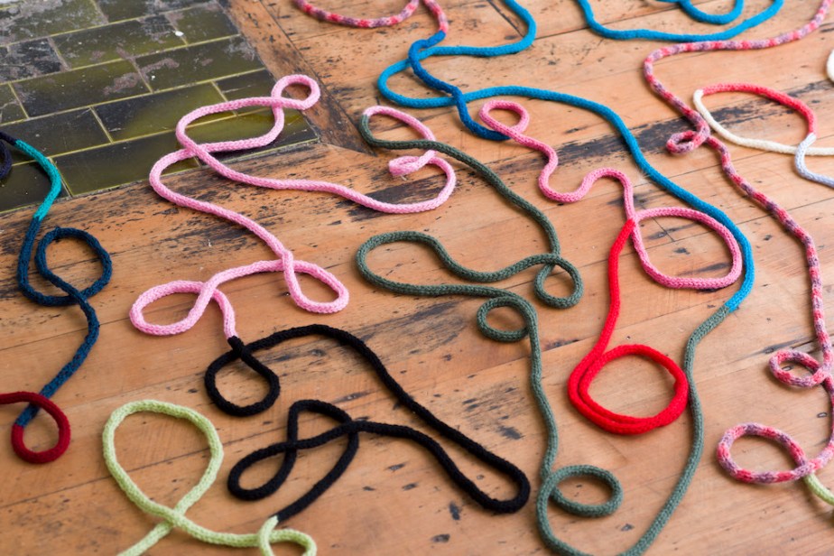Arm chair from our family home, String Theory french knitting (2003 – ongoing), children’s drawing.